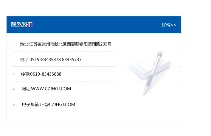地址:常州市新北區友邦商務大廈1幢16、17層  電話:0519-85101652  傳真:0519-85112595  郵編:213022  網址:www.cz-jiayue_cn.hzyongda.com  郵箱:xiajifengaa@163.com